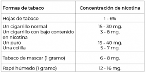 | Pico sérico | Concentración plasmática máxima variable según la vía de exposición: Fumada: 2 a 10 minutos. Inhalada: 9 minutos. Pulverización bucal: 13 minutos. Oral: 15 minutos. Chicle: 15 a 30 minutos. Parche transdérmico: 6 – 12 horas. |